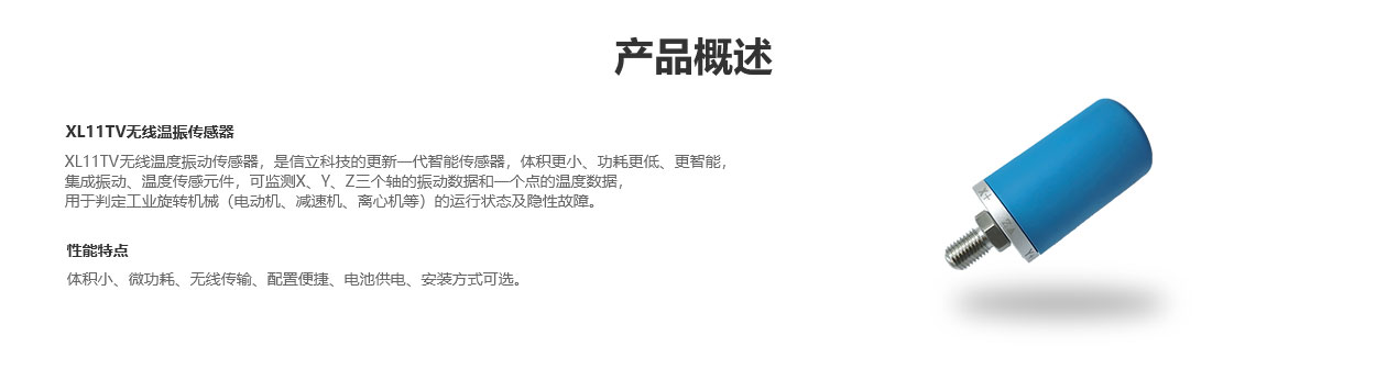 XL11TV無線溫度振動傳感器,是信立科技的更新一代智能傳感器,體積更小、功耗更低、更智能,集成振動、溫度傳感元件,可監測X、Y、Z三個軸的振動數據和一個點的溫度數據,用于判定工業旋轉機械(電動機、減速機、離心機等)的運行狀態及隱性故障。