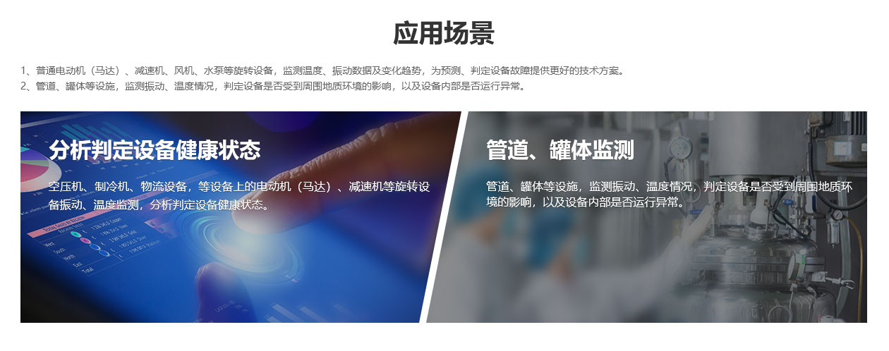 2、管道、罐體等設施,監測振動、溫度情況,判定設備是否受到周圍地質環境的影響,以及設備內部是否運行異常。