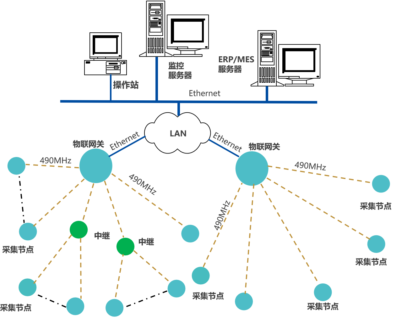 采集節(jié)點數(shù)據,通過LoRa上傳數(shù)據至物聯(lián)網關,網關通過Ethernet或Wi-Fi,接入LAN,推送數(shù)據至企業(yè)生產管控服務器