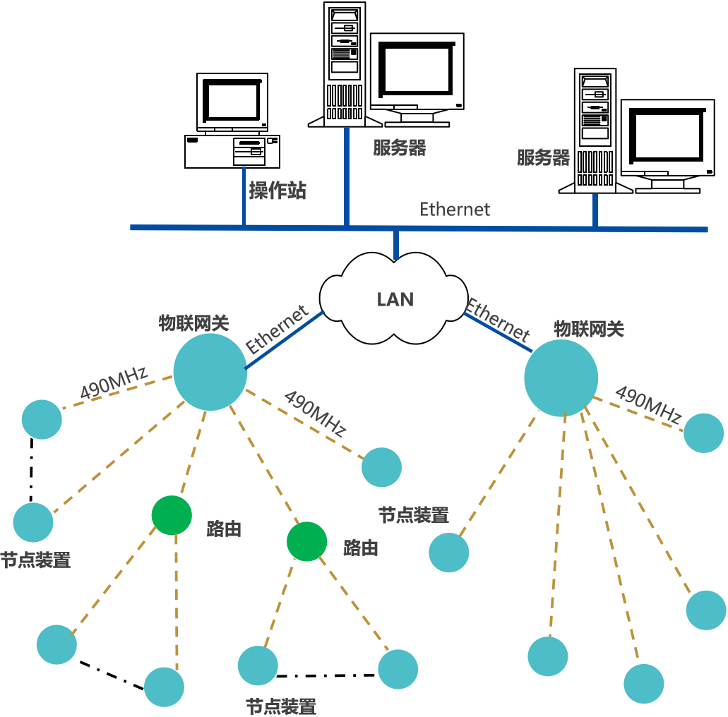 節(jié)點裝置(智能轉(zhuǎn)換器/智能轉(zhuǎn)換裝置),通過490MHz上傳數(shù)據(jù)至物聯(lián)網(wǎng)關(guān),網(wǎng)關(guān)通過Ethernet接入企業(yè)內(nèi)部LAN,推送設(shè)備生產(chǎn)數(shù)據(jù),至企業(yè)生產(chǎn)監(jiān)控平臺