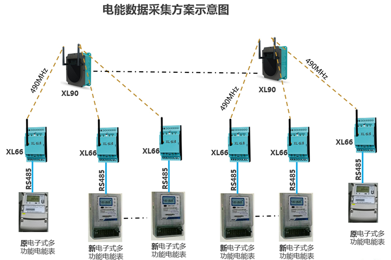 其它用電監(jiān)測(cè)點(diǎn),每個(gè)監(jiān)測(cè)點(diǎn)配置1塊DTSD3366G電子式多功能電能表和1臺(tái)XL66智能轉(zhuǎn)換器,獲取監(jiān)測(cè)點(diǎn)的用電數(shù)據(jù),上傳至XL90物聯(lián)網(wǎng)關(guān)