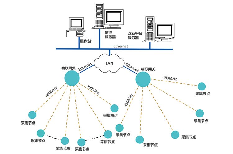 采集節(jié)點(diǎn)通過490MHz無線上傳數(shù)據(jù)至物聯(lián)網(wǎng)關(guān),網(wǎng)關(guān)通過Ethernet接入LAN,推送數(shù)據(jù)至企業(yè)管理平臺服務(wù)器;