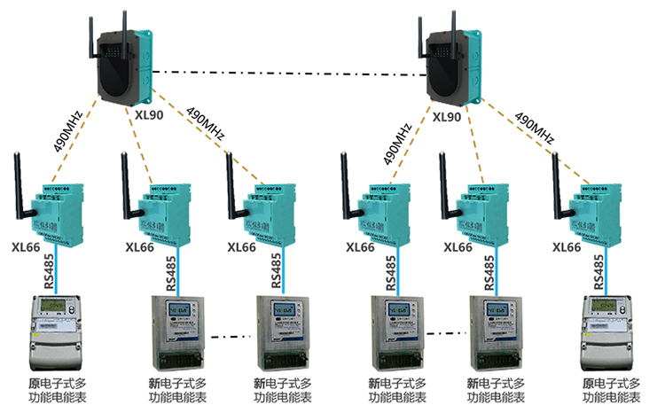 已安裝有電子式多功能電能表的電能監(jiān)測點(diǎn)(共有4個監(jiān)測點(diǎn)),每個監(jiān)測點(diǎn)配置1臺XL66智能轉(zhuǎn)換器,從電能表讀取用電數(shù)據(jù)上傳至XL90物聯(lián)網(wǎng)關(guān);