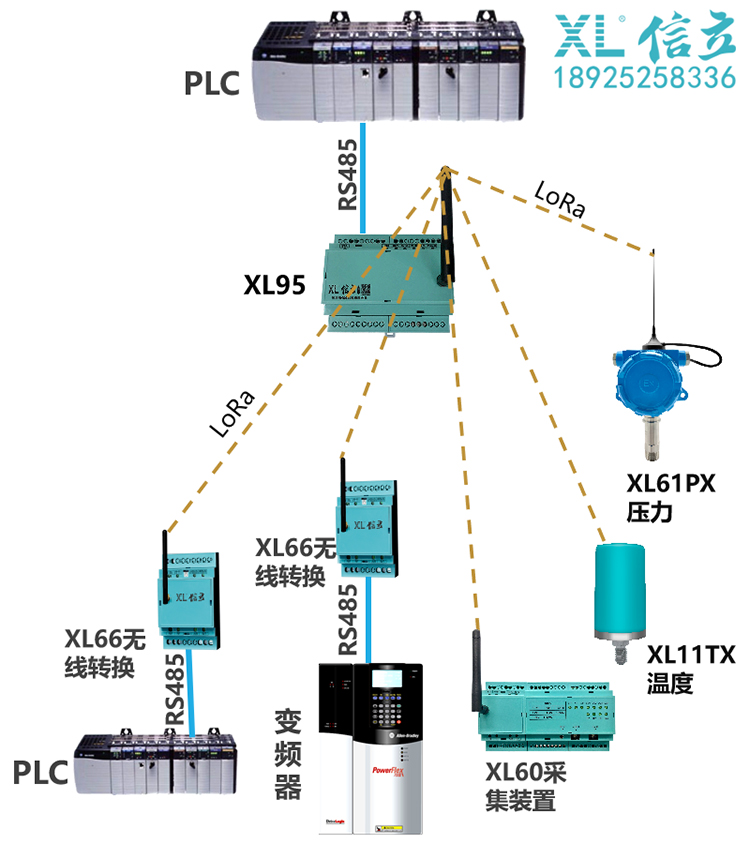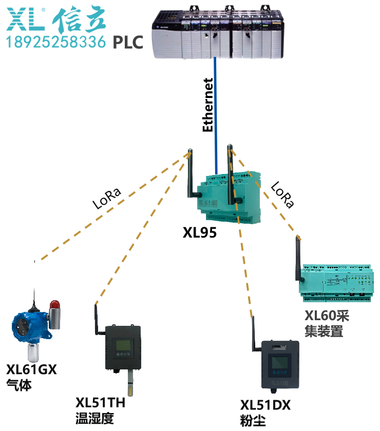 XL9X網(wǎng)關(guān),無(wú)線讀取采集節(jié)點(diǎn)的數(shù)據(jù),通過(guò)RS485,Ethernet轉(zhuǎn)發(fā)數(shù)據(jù)至PLC;