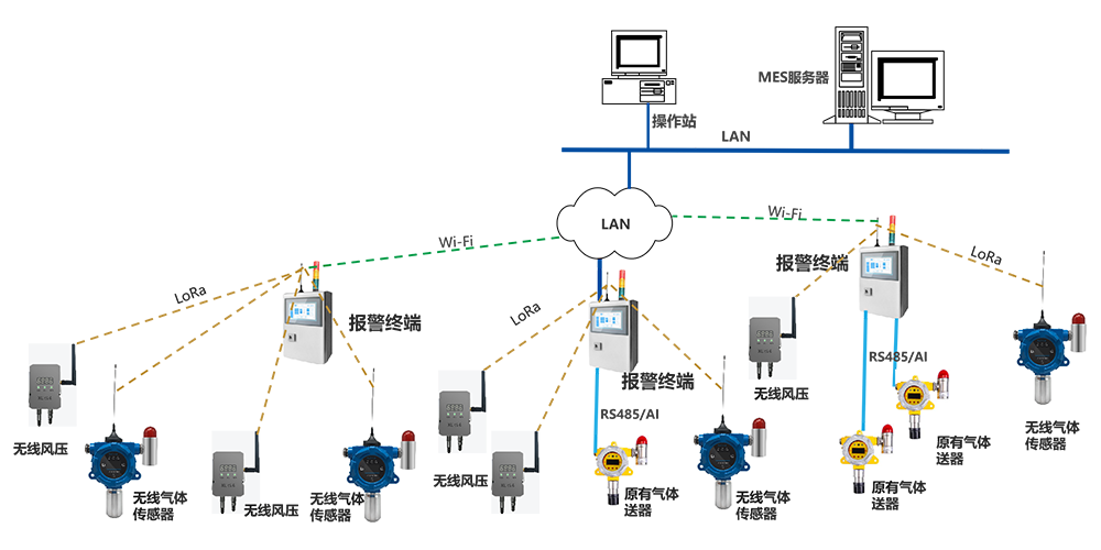 原有的氣體傳感器,通過有線方式接入分布安裝的報警終端;支持RS485、DC4-20mA、DC0-5V、Ethernet等方式接入。