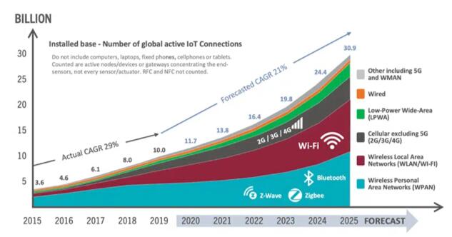 圖2:使用不同技術(shù)的物聯(lián)網(wǎng)設(shè)備的實(shí)際和預(yù)測(cè)數(shù)量