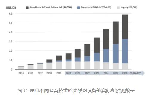 圖3:使用不同蜂窩技術(shù)的物聯(lián)網(wǎng)設(shè)備的實(shí)際和預(yù)測(cè)數(shù)量