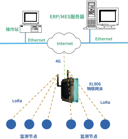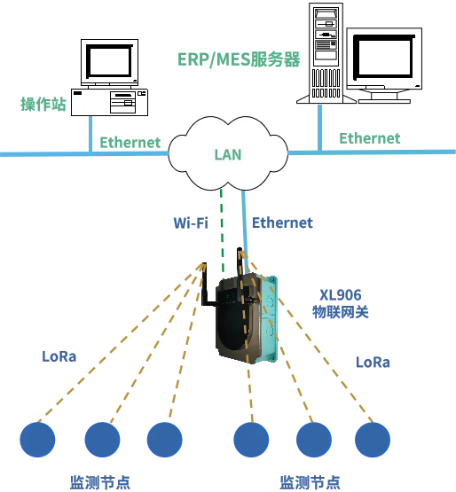 XL906物聯(lián)網(wǎng)關(guān),無線讀取監(jiān)測(cè)節(jié)點(diǎn)的數(shù)據(jù),進(jìn)行處理、協(xié)議轉(zhuǎn)換,通過以太網(wǎng)(Ethernet)或Wi-Fi,轉(zhuǎn)發(fā)數(shù)據(jù)至MES、ERP、EMS等多個(gè)工廠數(shù)字化平臺(tái),實(shí)現(xiàn)數(shù)據(jù)聯(lián)網(wǎng)、集中監(jiān)控分析。