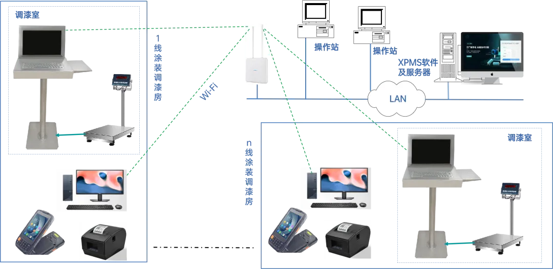 信立智能調漆系統由服務器及平臺軟件、調漆終端、出入庫終端、Wi-Fi網絡構成。